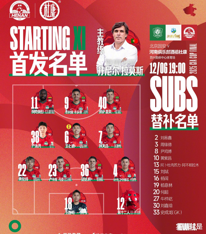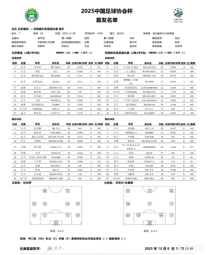 12月6日晚,备受关注的2025中国足协杯决赛,在苏州奥体中心体育场打响,北京国安与河南队争夺冠军。赛前,两队首发名单公布。